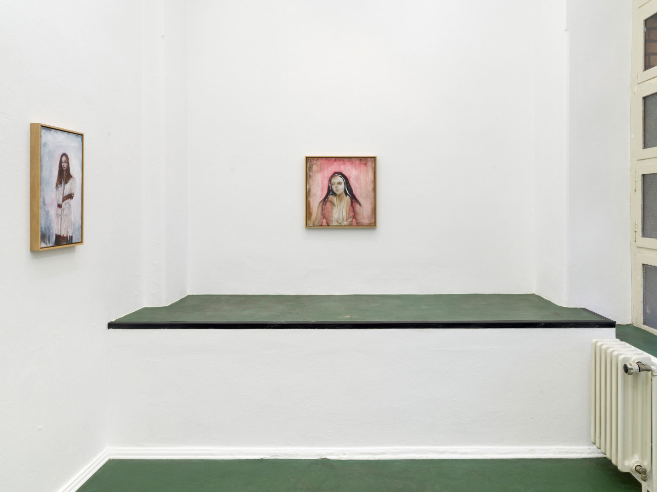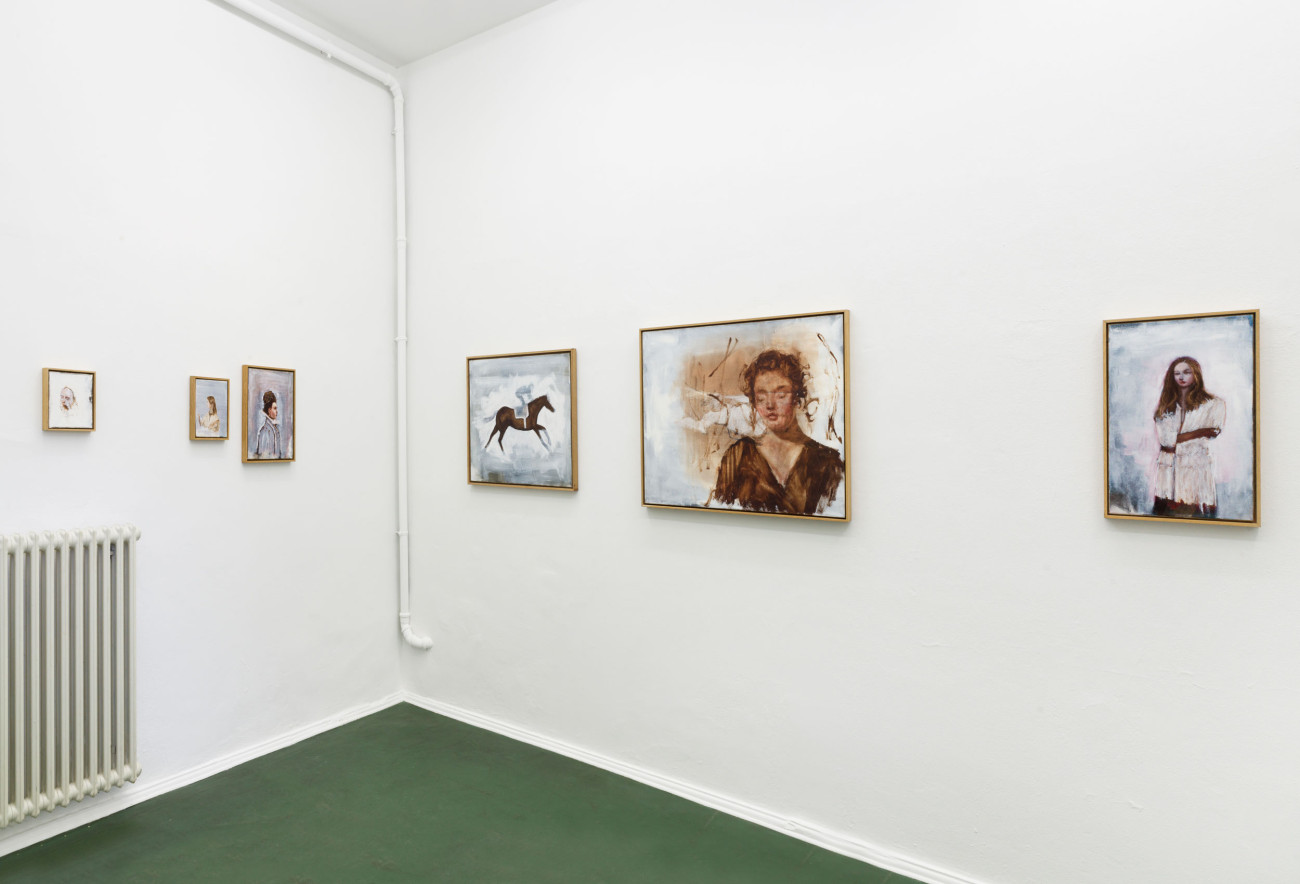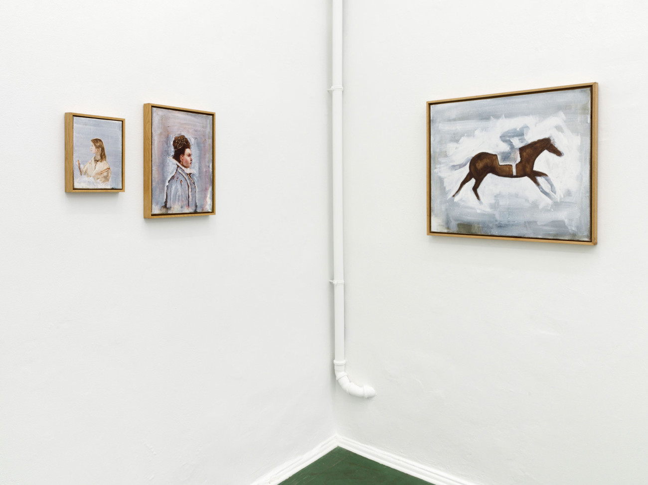 Axel Geis und Gregor Hildebrandt kennen sich, seit sie sich vor vielen Jahren im Rahmen einer studentischen Gruppenausstellung in Mainz begegneten. Gregor sah eine kleinformatige Arbeit Axels, das einzige Ölbild der ganzen Ausstellung, ein wenig unvorteilhaft gehängt – und doch wusste er, dass er gerade etwas ganz Außergewöhnliches geschaut hatte. Das Bild machte den Eindruck, als sei es von irgendeinem Dachboden eher irrtümlich in der Ausstellung gelandet. Grund dafür dürfte die entrückte Qualität von Geis’ Arbeiten sein. Die melancholischen Blicke der Figuren, die sich nur im Ausnahmefall mit dem der Betrachterin treffen, wenn sie ihr nicht gleich den Rücken zuwenden. Wie verloren stehen diese Abgebildeten – die Werktitel weisen sie, wenn überhaupt, lediglich als „Figuren“, „Mann“ oder „Frau“ aus – mit schweren Lidern und wie rotgeweinten oder -getrunkenen Nasen in umkonturierten, verschatteten Räumen ohne Tiefe herum. Nichts scheint sie zu halten, ihre Körper, manche so durchscheinend wie die von Gespenstern, werfen keine Schatten. Ihre Kleider, oft sind es Hausmäntel, Kittel oder Uniformen, wirken wie aus einer anderen Zeit.