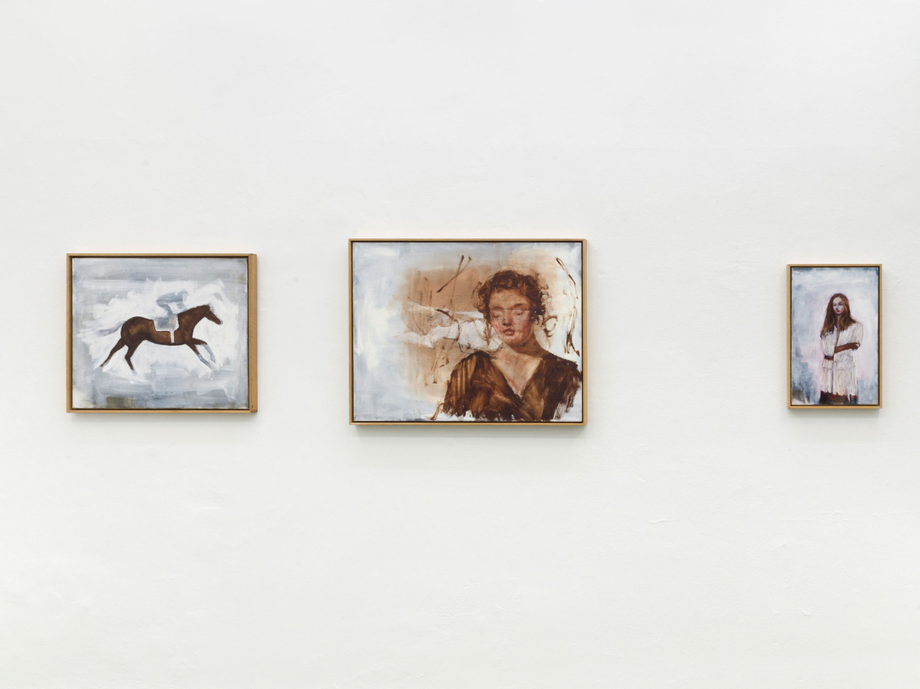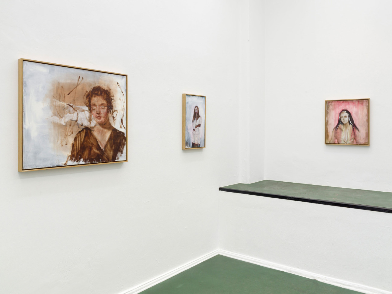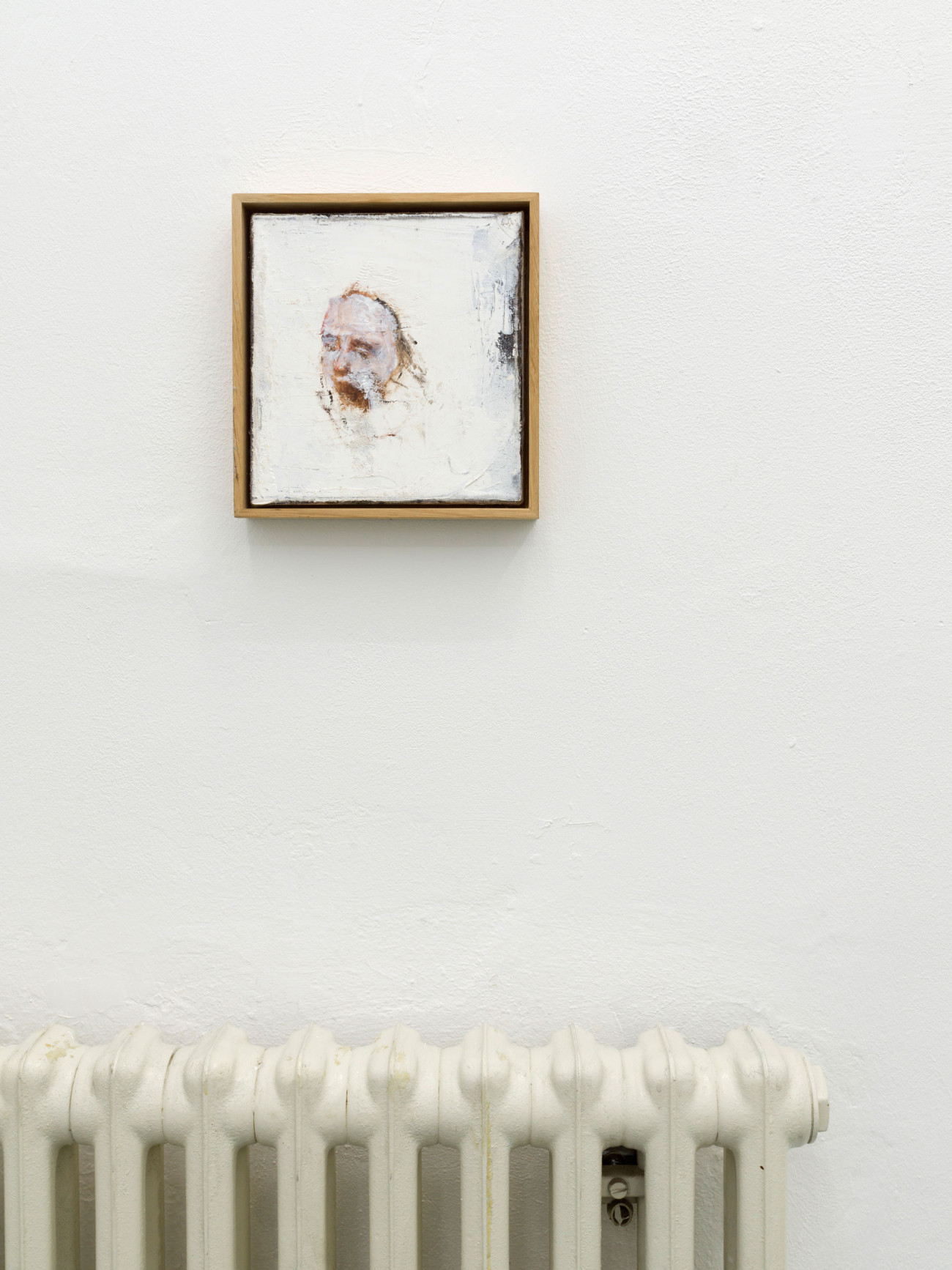 Axel Geis und Gregor Hildebrandt kennen sich, seit sie sich vor vielen Jahren im Rahmen einer studentischen Gruppenausstellung in Mainz begegneten. Gregor sah eine kleinformatige Arbeit Axels, das einzige Ölbild der ganzen Ausstellung, ein wenig unvorteilhaft gehängt – und doch wusste er, dass er gerade etwas ganz Außergewöhnliches geschaut hatte. Das Bild machte den Eindruck, als sei es von irgendeinem Dachboden eher irrtümlich in der Ausstellung gelandet. Grund dafür dürfte die entrückte Qualität von Geis’ Arbeiten sein. Die melancholischen Blicke der Figuren, die sich nur im Ausnahmefall mit dem der Betrachterin treffen, wenn sie ihr nicht gleich den Rücken zuwenden. Wie verloren stehen diese Abgebildeten – die Werktitel weisen sie, wenn überhaupt, lediglich als „Figuren“, „Mann“ oder „Frau“ aus – mit schweren Lidern und wie rotgeweinten oder -getrunkenen Nasen in umkonturierten, verschatteten Räumen ohne Tiefe herum. Nichts scheint sie zu halten, ihre Körper, manche so durchscheinend wie die von Gespenstern, werfen keine Schatten. Ihre Kleider, oft sind es Hausmäntel, Kittel oder Uniformen, wirken wie aus einer anderen Zeit.