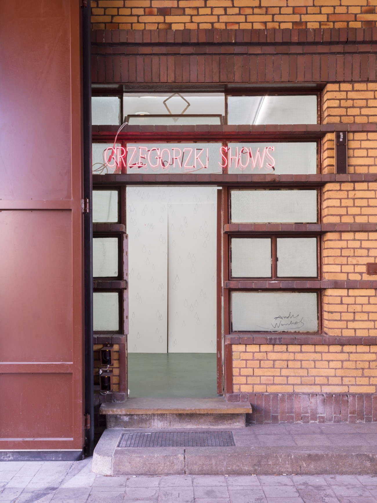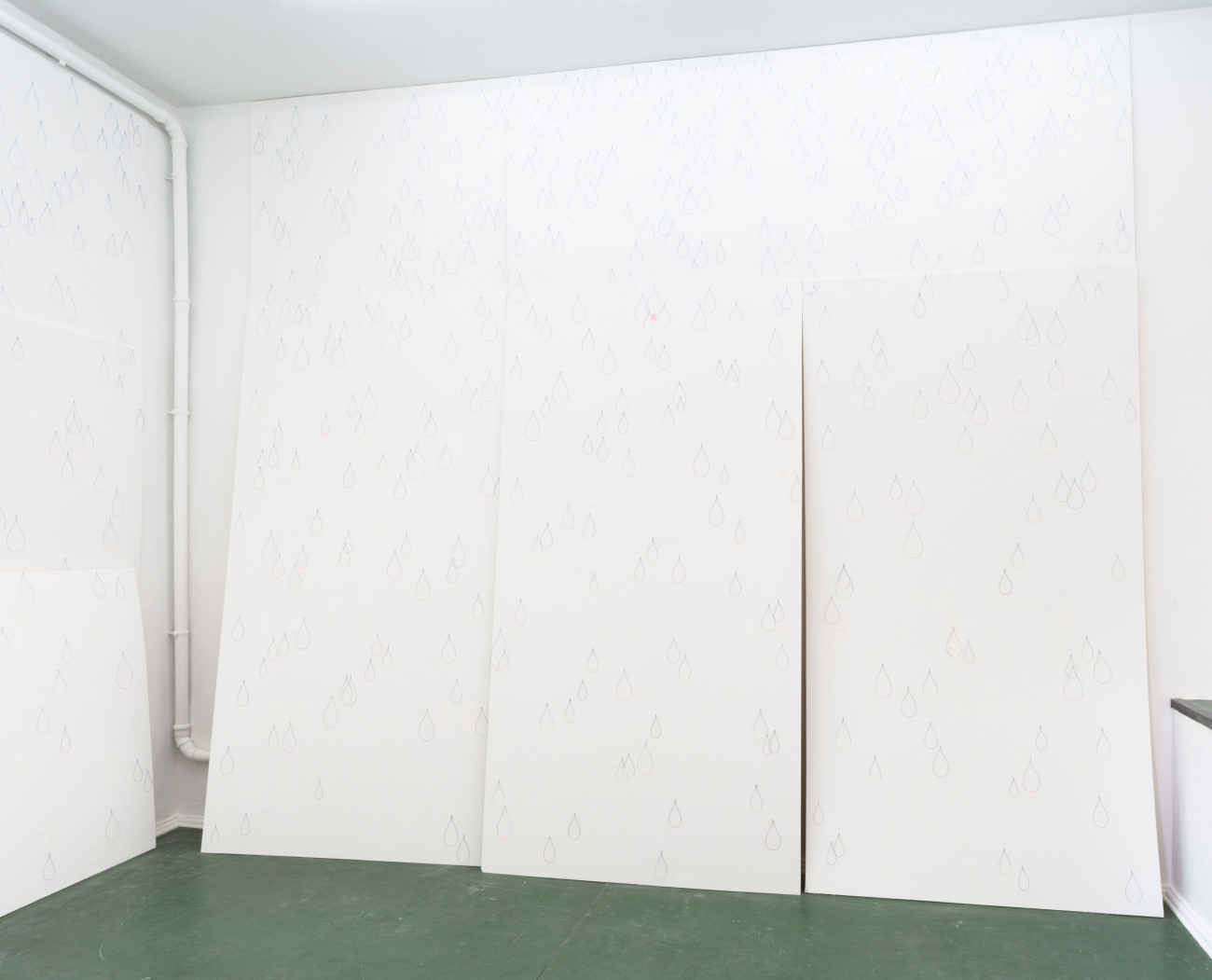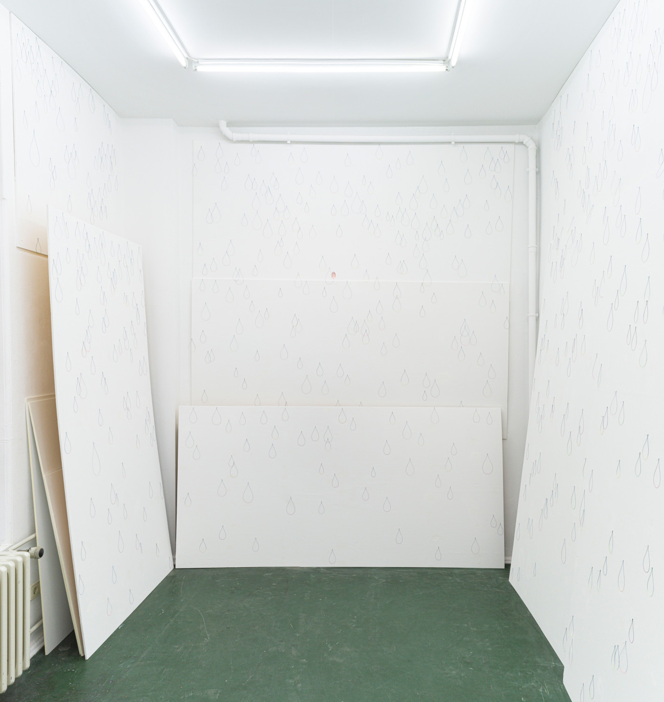 Der Raum von Grzegorzki Shows ist klein, und die Wände werden vollständig bedeckt sein. Ich würde mir wünschen, dass diese Installation etwas Verzaubertes hat, wie die Malerei in einer winzigen Kapelle, die trotzdem weite Räume evoziert. Ich weiß nicht, ob man die Parallele zu einem Wassertropfen ziehen kann: Dort lässt sich die gleiche Umkeh- rung beobachten, ein winziger Raum, der visuell seine ganze Umgebung aufnimmt, in dem sich alles spiegelt, was er umfasst. Auf das Risiko hin, zu explizit zu werden, könnte man vielleicht eine tropfenförmige Glasperle in der Raum- mitte aufhängen – je nachdem, wie anspielungsreich die Installation ausfallen soll.