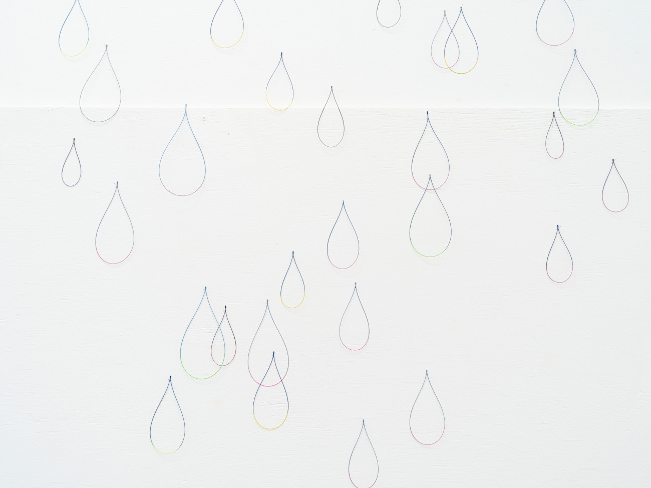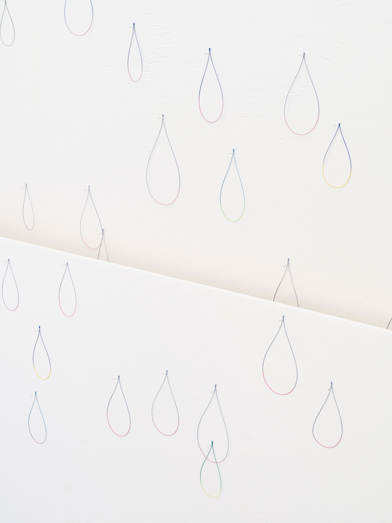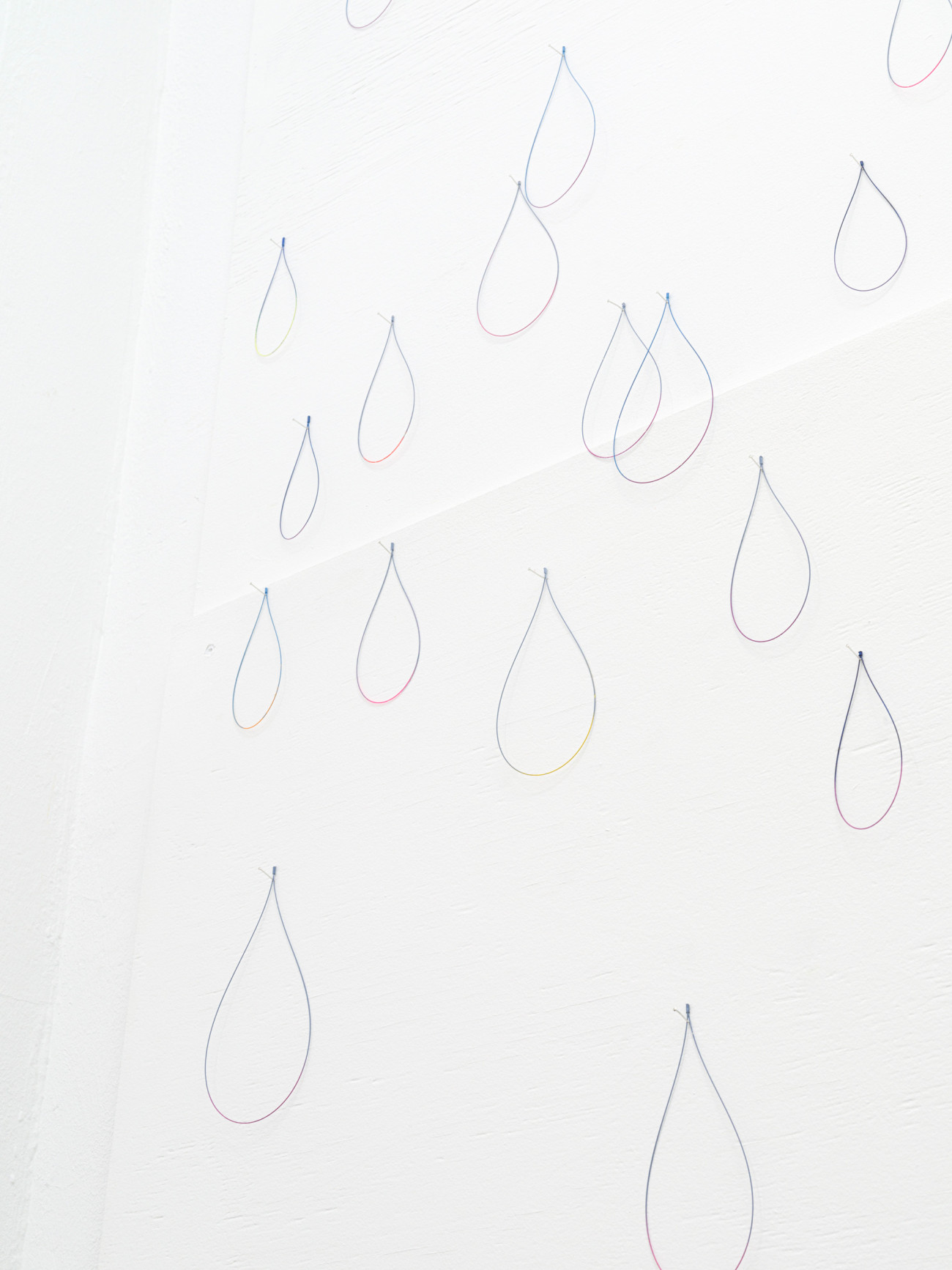 Da ich diese Arbeit noch nie installiert habe, kenne ich „Jolie pluie“ noch nicht. Aus feinen, gebogenen und an- schließen bemalten Stahlstäben haben wir ungefähr 3.000 tropfenförmige unterschiedlich große Teile mit verschie- denen Farben angefertigt. Jeder Tropfen hat zwei Farben, eine matte und eine kräftige. Sie werden hier und da an den Wänden der Ausstellungsfläche befestigt, an Nadeln, damit sie zittern und einem Regenvorhang ähneln, einer Haut mit glitzernden Schuppen. Ich hoffe, dass sich ein komplexes, irisierendes Spiel der Farben entwickeln wird, dass die Schwingungen an einen Regenbogen denken lassen.