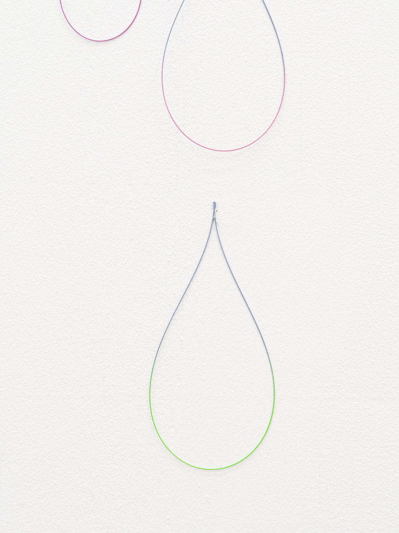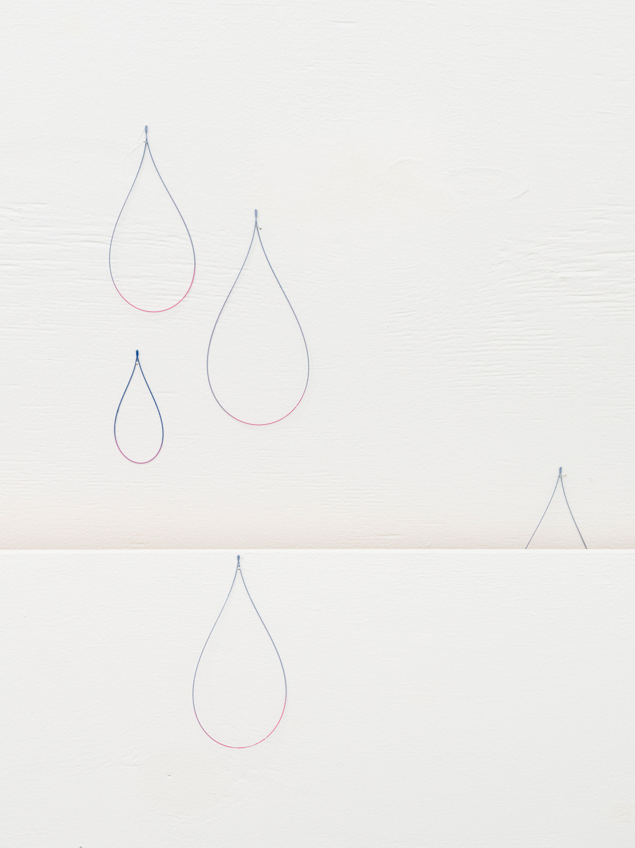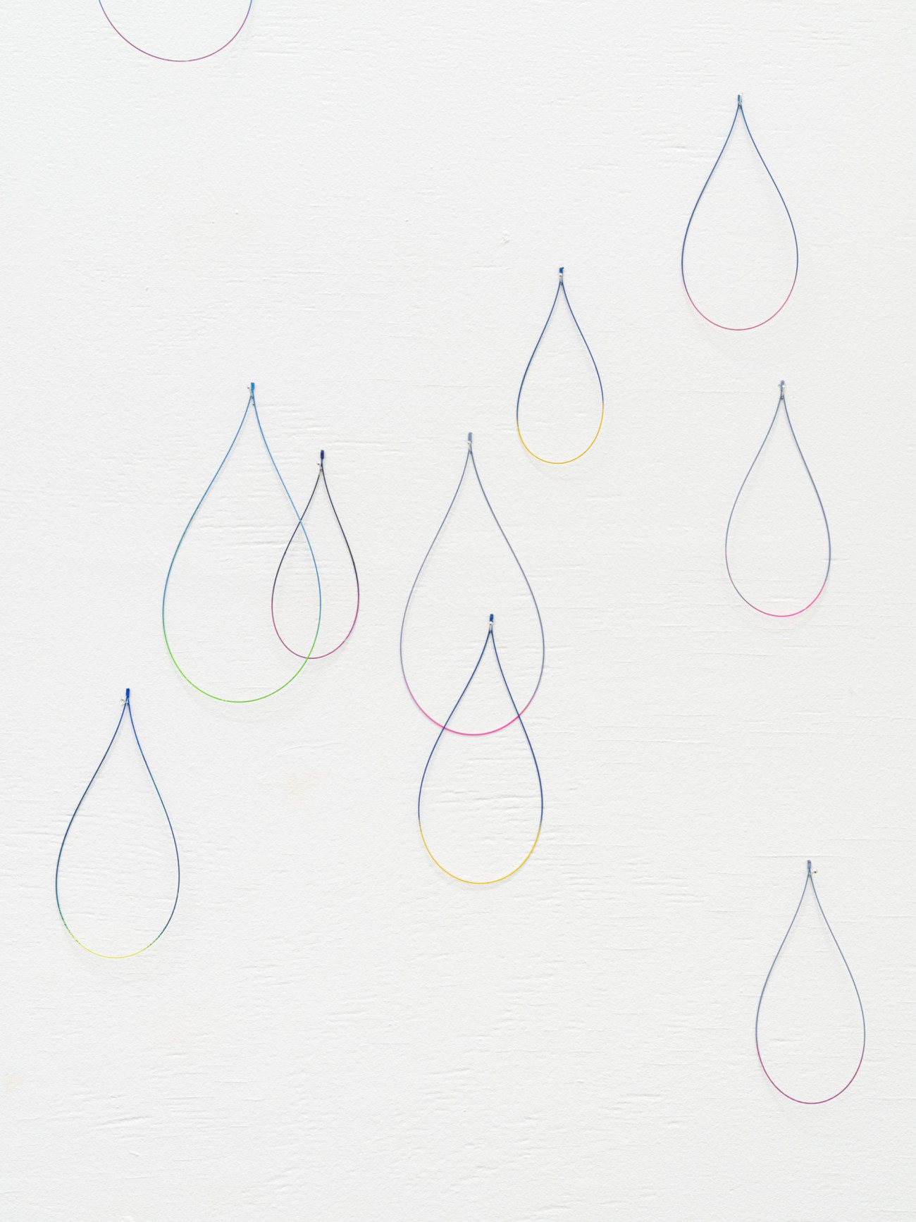Da ich diese Arbeit noch nie installiert habe, kenne ich „Jolie pluie“ noch nicht. Aus feinen, gebogenen und an- schließen bemalten Stahlstäben haben wir ungefähr 3.000 tropfenförmige unterschiedlich große Teile mit verschie- denen Farben angefertigt. Jeder Tropfen hat zwei Farben, eine matte und eine kräftige. Sie werden hier und da an den Wänden der Ausstellungsfläche befestigt, an Nadeln, damit sie zittern und einem Regenvorhang ähneln, einer Haut mit glitzernden Schuppen. Ich hoffe, dass sich ein komplexes, irisierendes Spiel der Farben entwickeln wird, dass die Schwingungen an einen Regenbogen denken lassen.