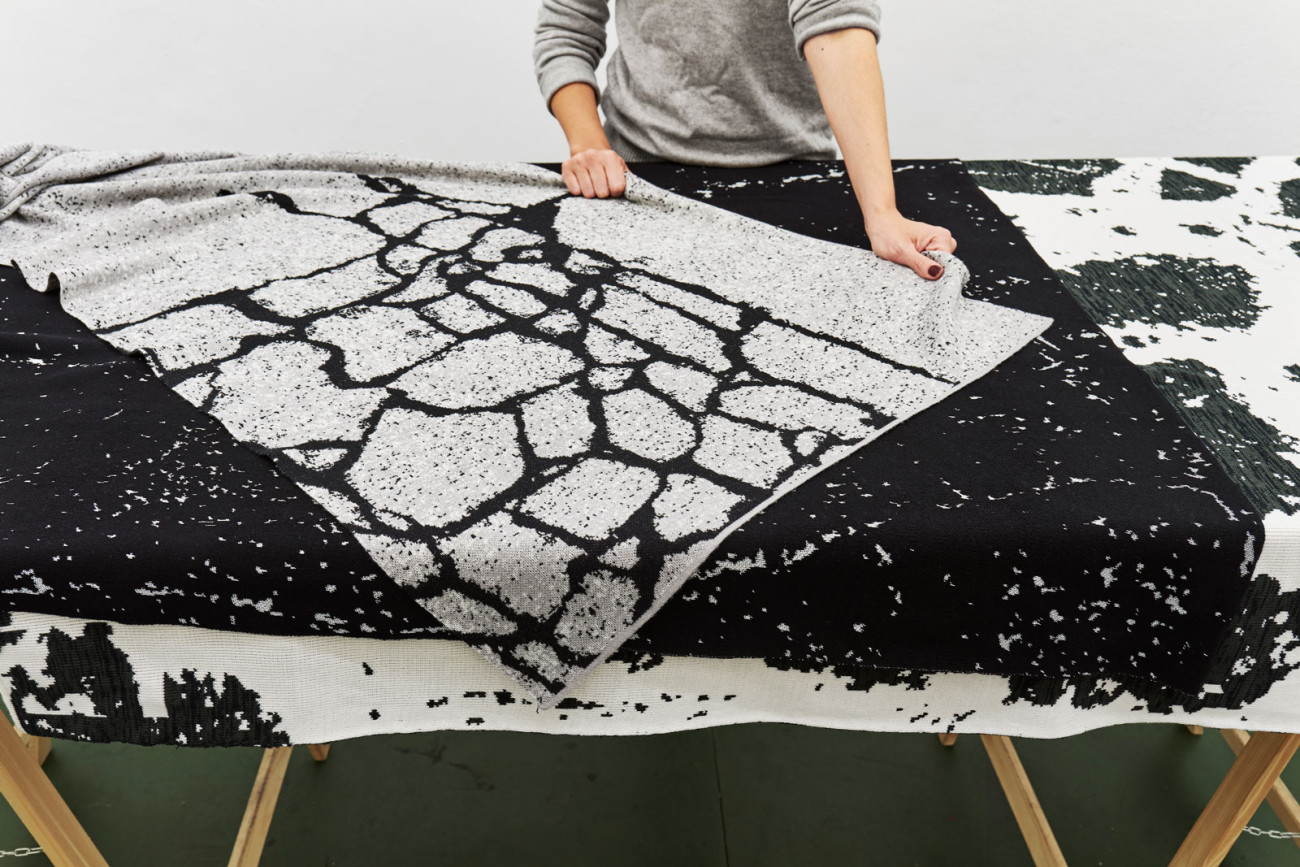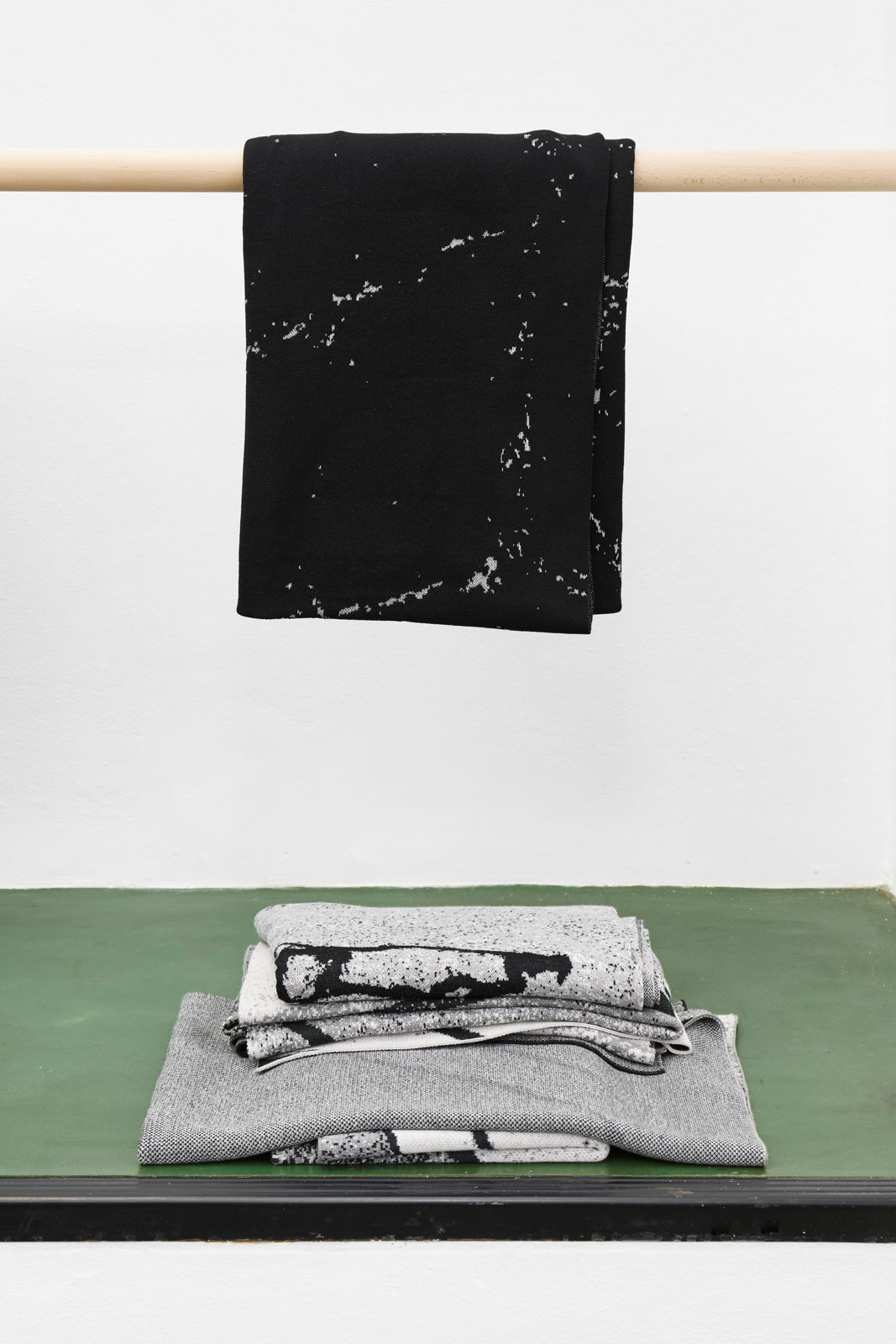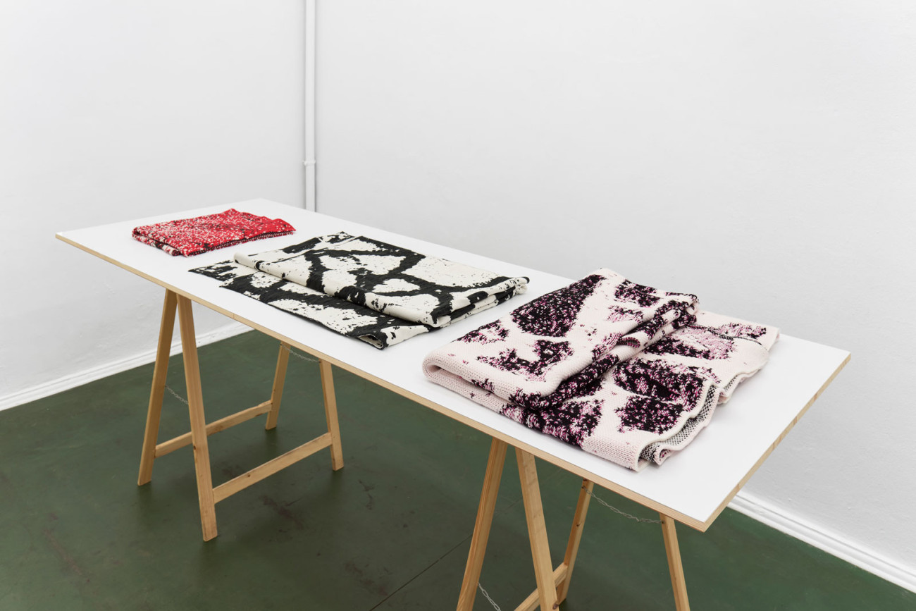 Wer Ordnung ausschließlich im Objekt an der Wand zu erkennen vermag wird bei Sascha Pohle nicht weit kommen. Der Künstler betrachtet die Strickbilder seiner Serie Passage (2016ff) nicht nur als horizontale Bilder. Vielmehr definiert er die fototextilen Stücke als performative Objekte, die durch die Bewegungen des wiederholten Faltens, Entfaltens und Auslegens oder Hängens zu animierten gestischen Stücken werden können. Jede Serie besteht aus einer Reihe von Textilien, die auf Fotografien des Bodens basieren ohne sich in erkennbare Darstellungen oder Bildern aufzulösen. Sie verwenden Muster und Mimikry als materielle und visuelle Oberflächenmodulationen, die das Bild als Ort selbst definieren. Mit ihrem unregelmäßigen Netzwerk aus Brüchen und Spalten deuten sie auf mehrere mögliche Faltungen hin. Ihr Charakter changiert zwischen einer Interpretation des real Vorhandenen und einer abstrakten Karte, die kein spezifisches Gebiet beschreibt obwohl sie Erinnerungen an einen konkreten Ort enthält. Jetzt also Berlin. Berlin ist weniger autobiografisch als Düsseldorf (Geburtsort) oder Amsterdam und Seoul (Wohnorte). Dafür wird erstmals der Ausstellungsort als wesentliches Kriterium in die Auswahl der Bildmotive einbezogen. Zum Ausgleich entfalten sich die Formate: Große Decken statt Tücher, gestrickt im wunderbaren Textillabor des Textilmuseums in Tilburg.