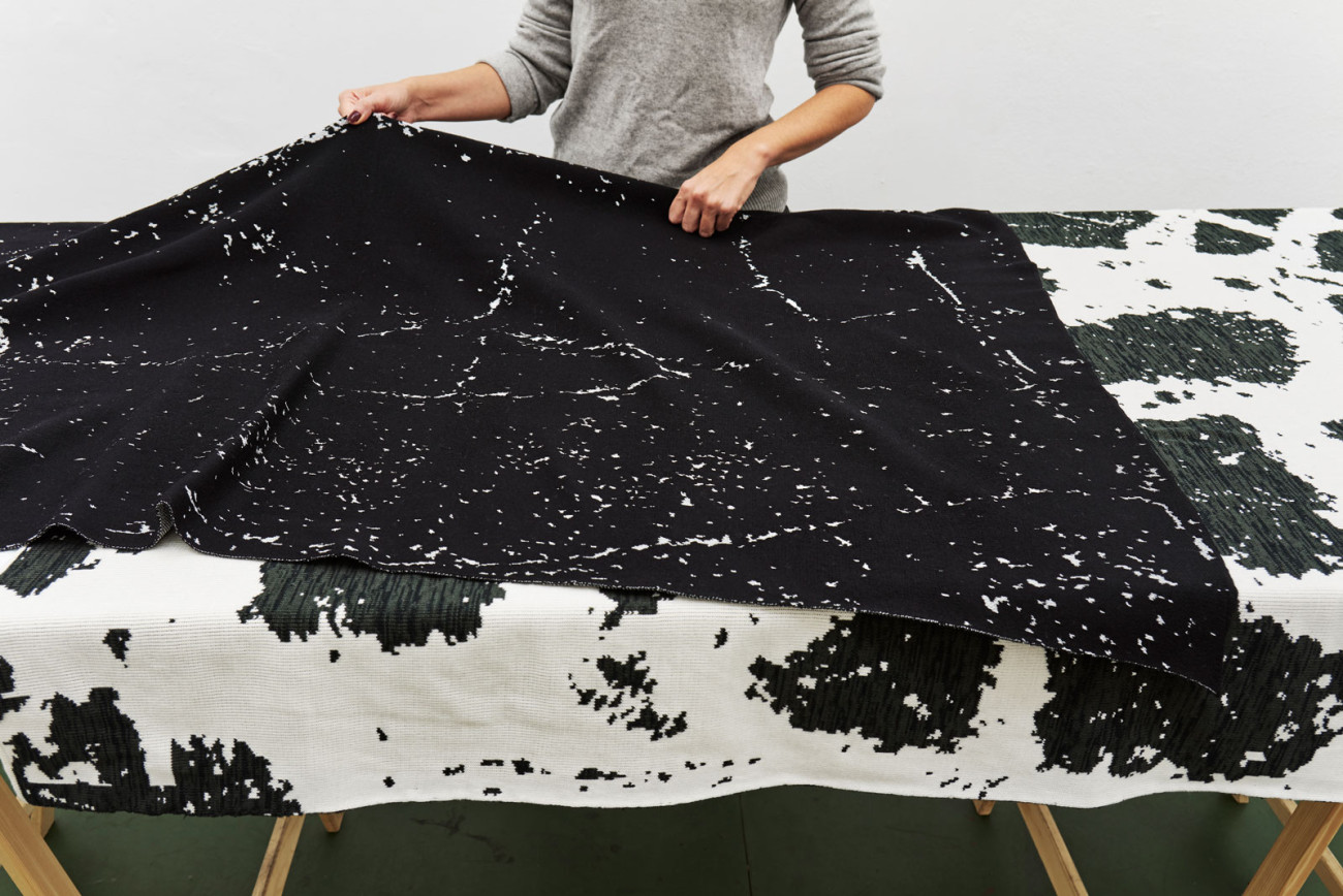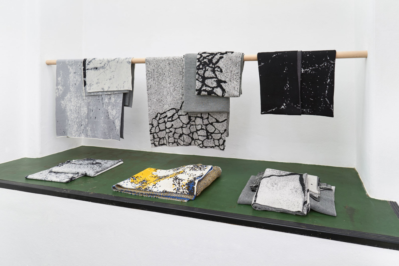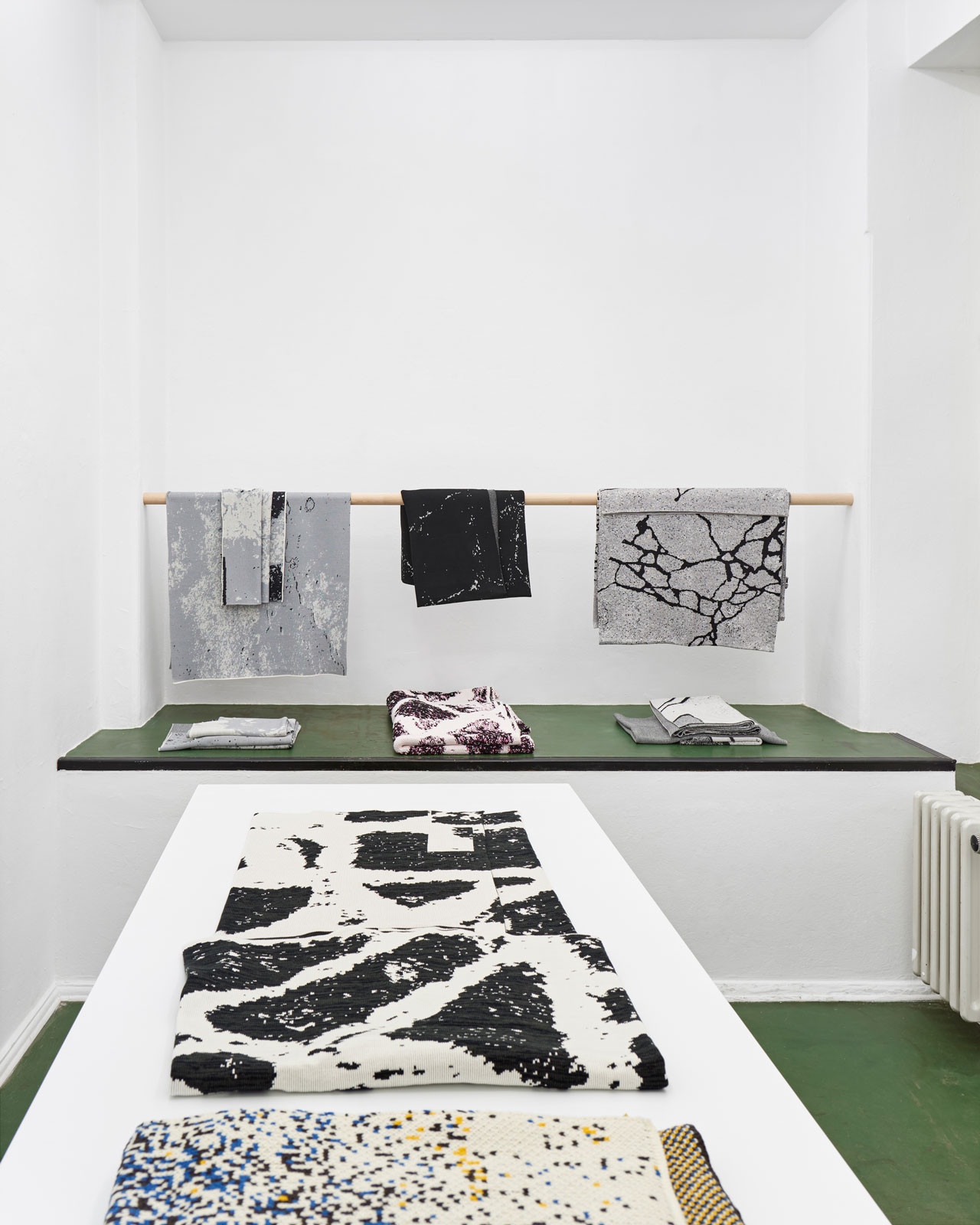 Wer Ordnung ausschließlich im Objekt an der Wand zu erkennen vermag wird bei Sascha Pohle nicht weit kommen. Der Künstler betrachtet die Strickbilder seiner Serie Passage (2016ff) nicht nur als horizontale Bilder. Vielmehr definiert er die fototextilen Stücke als performative Objekte, die durch die Bewegungen des wiederholten Faltens, Entfaltens und Auslegens oder Hängens zu animierten gestischen Stücken werden können. Jede Serie besteht aus einer Reihe von Textilien, die auf Fotografien des Bodens basieren ohne sich in erkennbare Darstellungen oder Bildern aufzulösen. Sie verwenden Muster und Mimikry als materielle und visuelle Oberflächenmodulationen, die das Bild als Ort selbst definieren. Mit ihrem unregelmäßigen Netzwerk aus Brüchen und Spalten deuten sie auf mehrere mögliche Faltungen hin. Ihr Charakter changiert zwischen einer Interpretation des real Vorhandenen und einer abstrakten Karte, die kein spezifisches Gebiet beschreibt obwohl sie Erinnerungen an einen konkreten Ort enthält. Jetzt also Berlin. Berlin ist weniger autobiografisch als Düsseldorf (Geburtsort) oder Amsterdam und Seoul (Wohnorte). Dafür wird erstmals der Ausstellungsort als wesentliches Kriterium in die Auswahl der Bildmotive einbezogen. Zum Ausgleich entfalten sich die Formate: Große Decken statt Tücher, gestrickt im wunderbaren Textillabor des Textilmuseums in Tilburg.