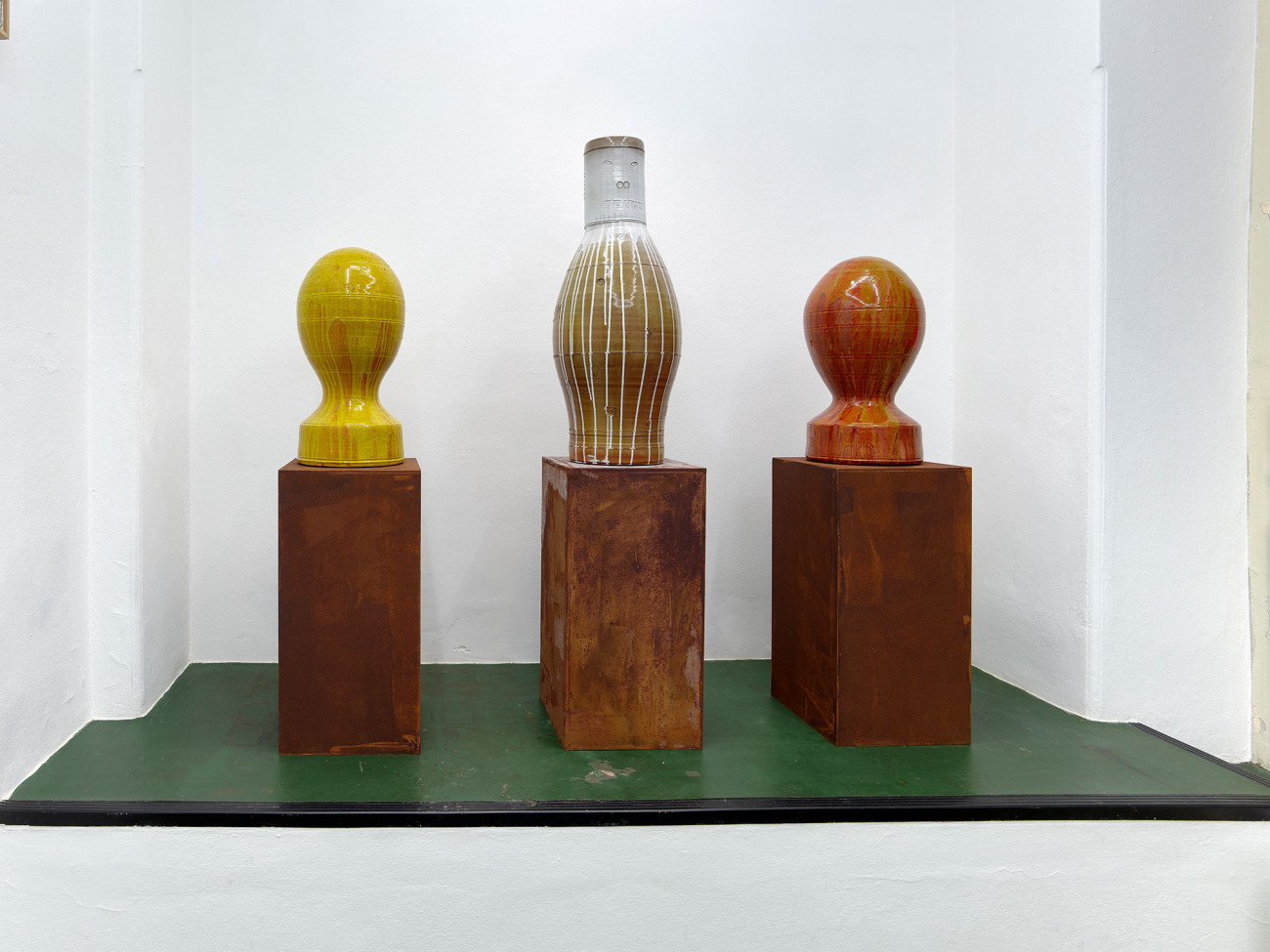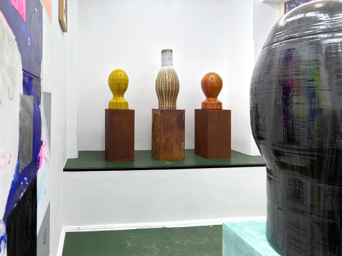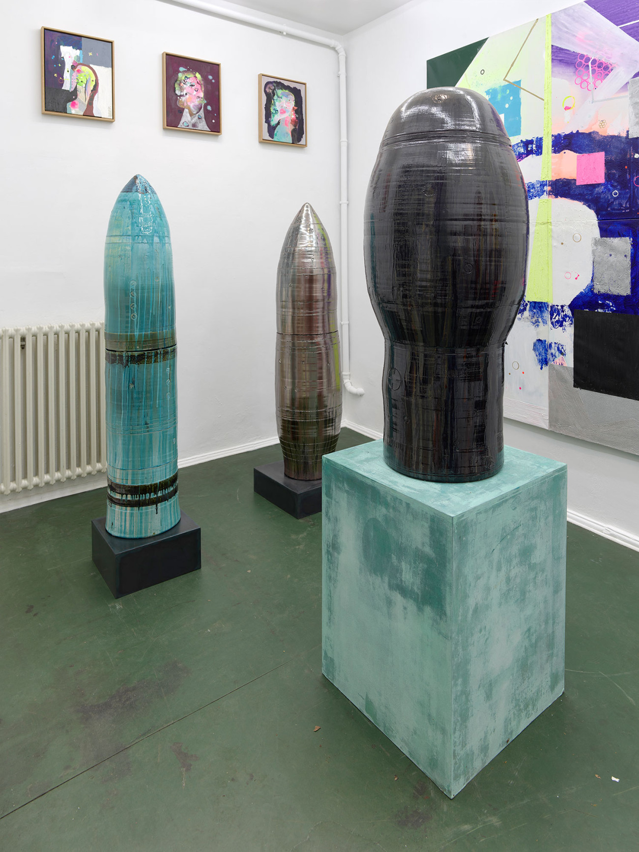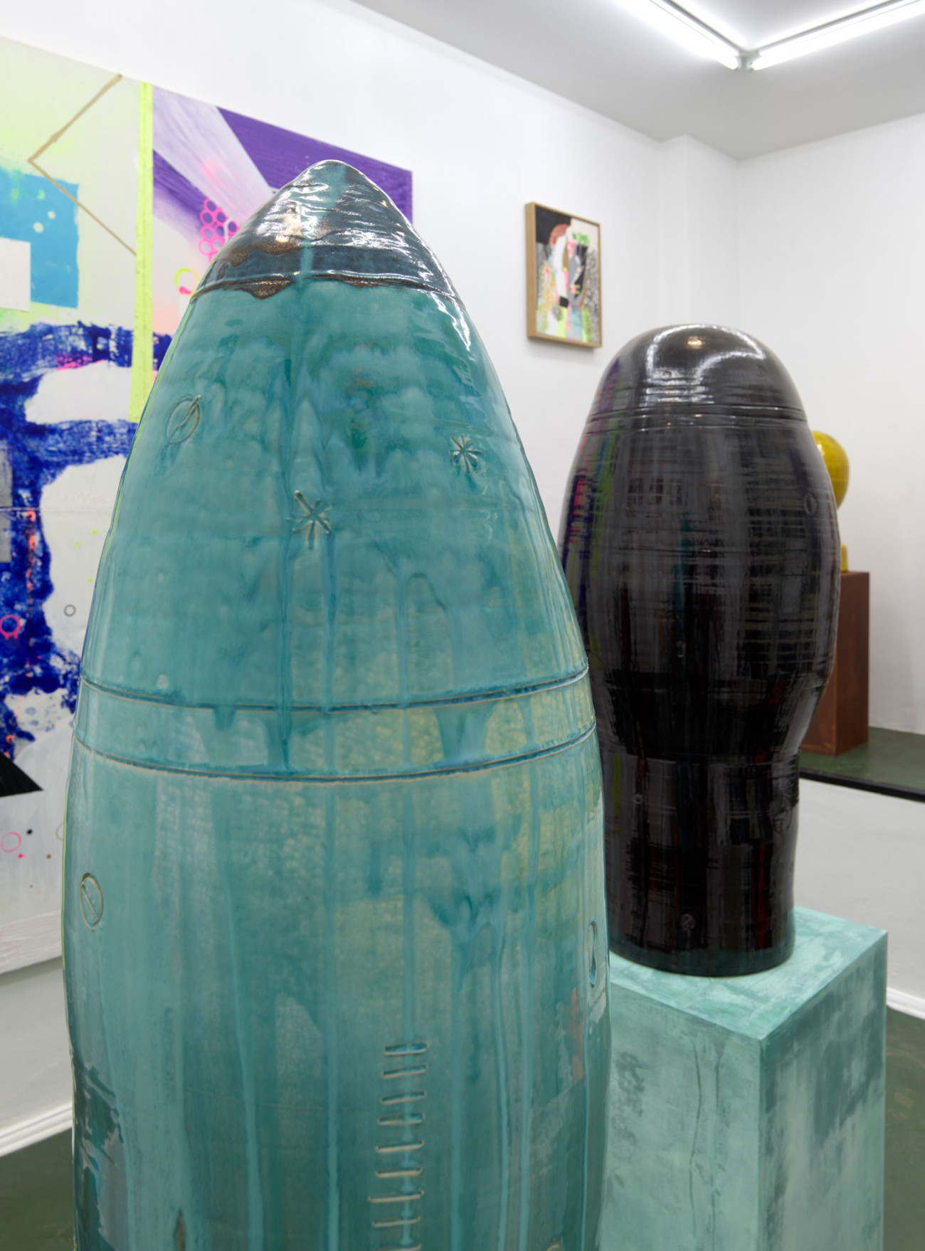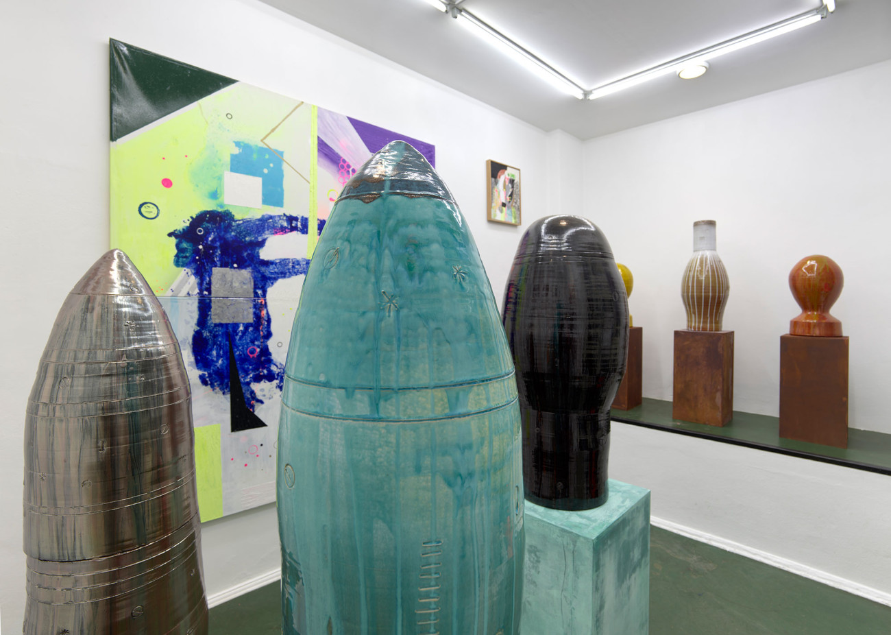 In der Ausstellung zeigt Beer auch Keramikskulpturen, die in Zusammenarbeit mit einem griechischen Keramiker entstanden. Nach der Serie von Figurenbildern hat Beer in den Keramikarbeiten eine technischere Form von Figuren und Köpfen entwickelt. Auch hier ähneln die Formen Raketen und Bomben: einer Symbiose aus Mensch und Ding. Diese Skulpturen werden dann mit verschiedenen Objekten aus dem Atelier des Künstlers versehen. Seine Arbeit beschreibt Beer so: „Manche Leute schreiben Lieder. Ich mache Dinge.“