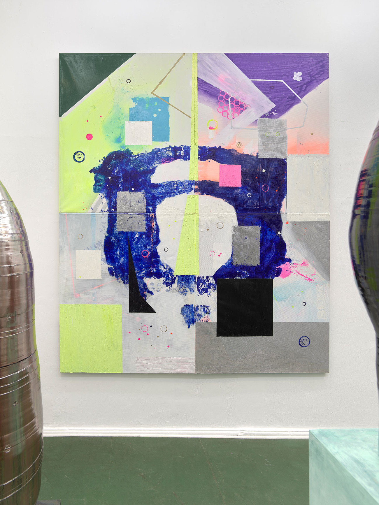 Grzegorzki Shows Berlin präsentiert neue Arbeiten des deutschen Künstlers Tjorg Douglas Beer, der genreübergreifen arbeitet und Collagen, Malereien und Skulpturen schafft. Der Ausstellungstitel Under the Octopus Tree verweist auf das Interesse des Künstlers an Fluchtszenarien: Seit 2019 verbringt Beer viel Zeit in Griechenland, und der Oktopusbaum ist ein Symbol für das Phantasma utopischen Lebens. Anstatt von einem konzeptionellen Standpunkt auszugehen, schöpft Beer in seiner Arbeit aus Lebenserfahrungen. In seiner Malerei mischt er Tinte, Marker, Lack, Acryl, Ölfarbe und Ölstift und entwickelt aus dem Malprozess Arrangements und Landschaften. So tauchen aus dem Übergang von sich überdeckenden Farben Gesichter und Figuren auf. Diese Figuren werden erhalten und dann in fragmentierten Szenarien angeordnet, die Landschaften, Innenräume oder Skulpturen sein können. Unvollendete Figuren, Quadrate und Farbübergänge führen zu collageartigen Bildern.