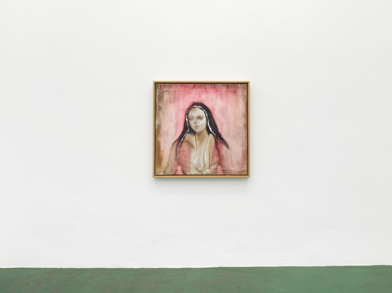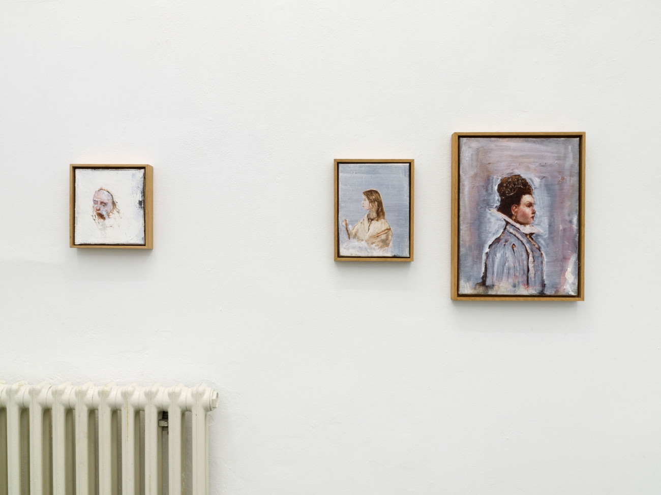 Axel Geis und Gregor Hildebrandt kennen sich, seit sie sich vor vielen Jahren im Rahmen einer studentischen Gruppenausstellung in Mainz begegneten. Gregor sah eine kleinformatige Arbeit Axels, das einzige Ölbild der ganzen Ausstellung, ein wenig unvorteilhaft gehängt – und doch wusste er, dass er gerade etwas ganz Außergewöhnliches geschaut hatte. Das Bild machte den Eindruck, als sei es von irgendeinem Dachboden eher irrtümlich in der Ausstellung gelandet. Grund dafür dürfte die entrückte Qualität von Geis’ Arbeiten sein. Die melancholischen Blicke der Figuren, die sich nur im Ausnahmefall mit dem der Betrachterin treffen, wenn sie ihr nicht gleich den Rücken zuwenden. Wie verloren stehen diese Abgebildeten – die Werktitel weisen sie, wenn überhaupt, lediglich als „Figuren“, „Mann“ oder „Frau“ aus – mit schweren Lidern und wie rotgeweinten oder -getrunkenen Nasen in umkonturierten, verschatteten Räumen ohne Tiefe herum. Nichts scheint sie zu halten, ihre Körper, manche so durchscheinend wie die von Gespenstern, werfen keine Schatten. Ihre Kleider, oft sind es Hausmäntel, Kittel oder Uniformen, wirken wie aus einer anderen Zeit.