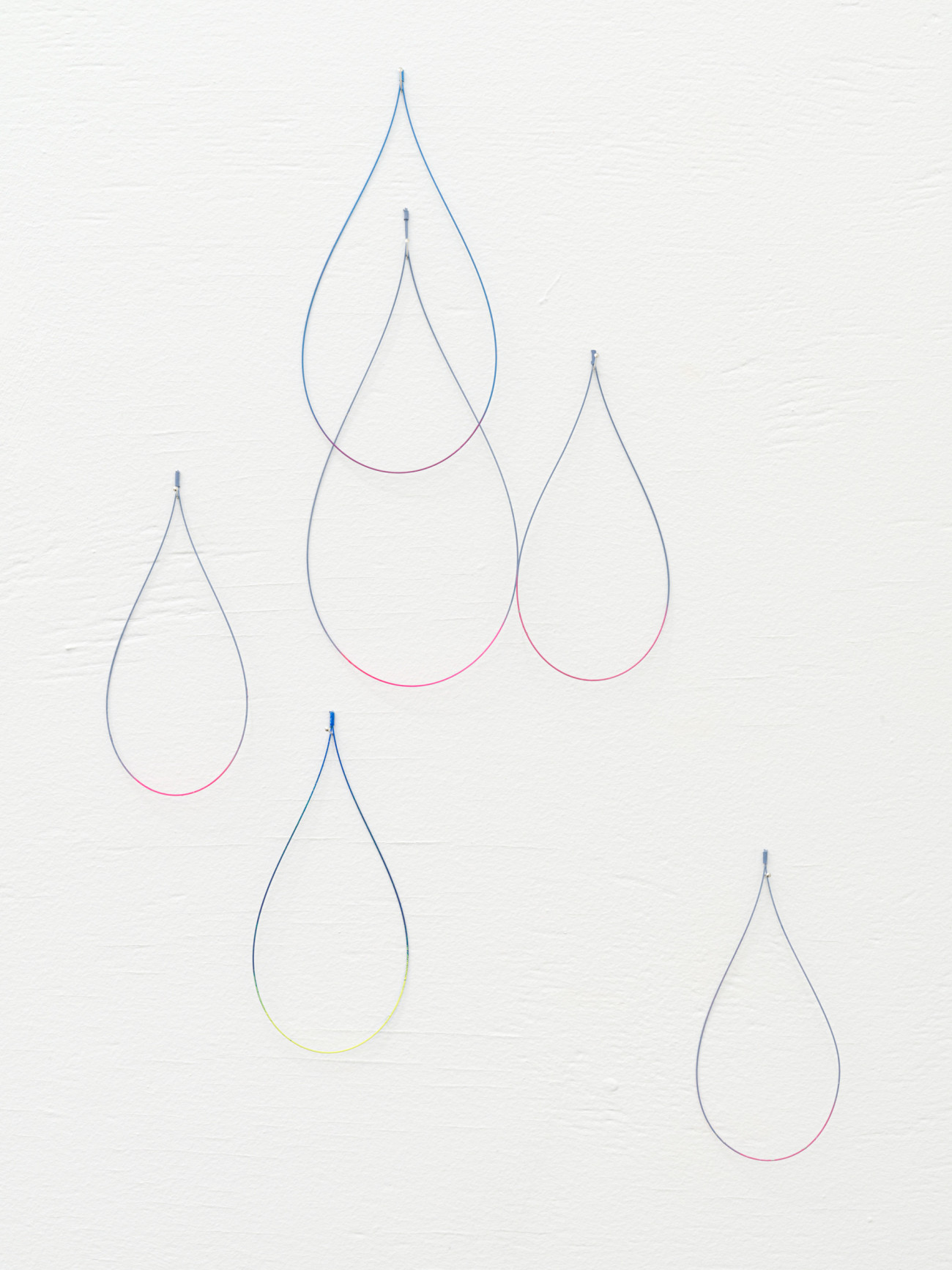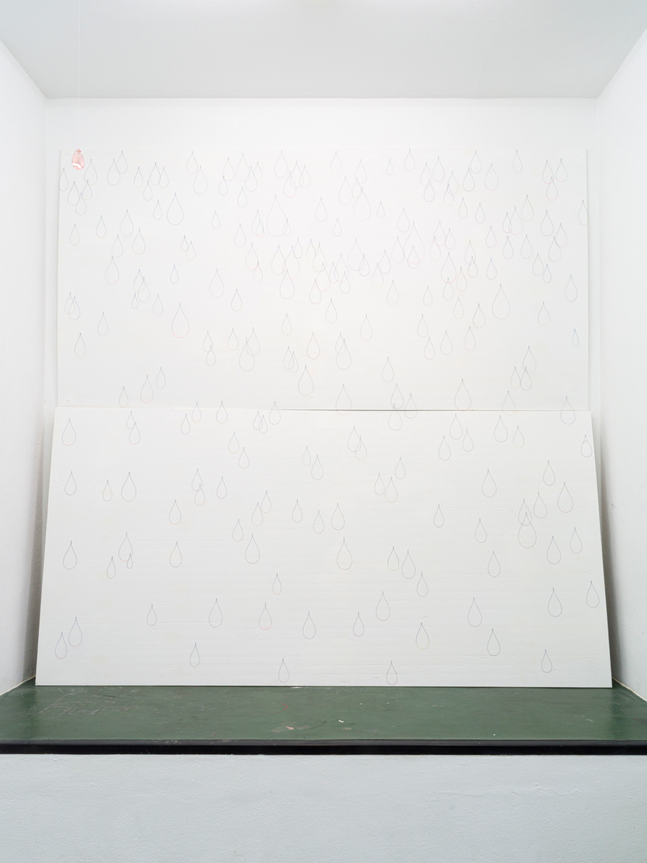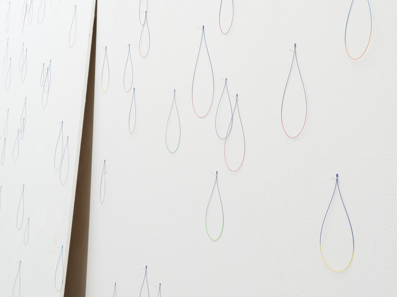 Da ich diese Arbeit noch nie installiert habe, kenne ich „Jolie pluie“ noch nicht. Aus feinen, gebogenen und an- schließen bemalten Stahlstäben haben wir ungefähr 3.000 tropfenförmige unterschiedlich große Teile mit verschie- denen Farben angefertigt. Jeder Tropfen hat zwei Farben, eine matte und eine kräftige. Sie werden hier und da an den Wänden der Ausstellungsfläche befestigt, an Nadeln, damit sie zittern und einem Regenvorhang ähneln, einer Haut mit glitzernden Schuppen. Ich hoffe, dass sich ein komplexes, irisierendes Spiel der Farben entwickeln wird, dass die Schwingungen an einen Regenbogen denken lassen.